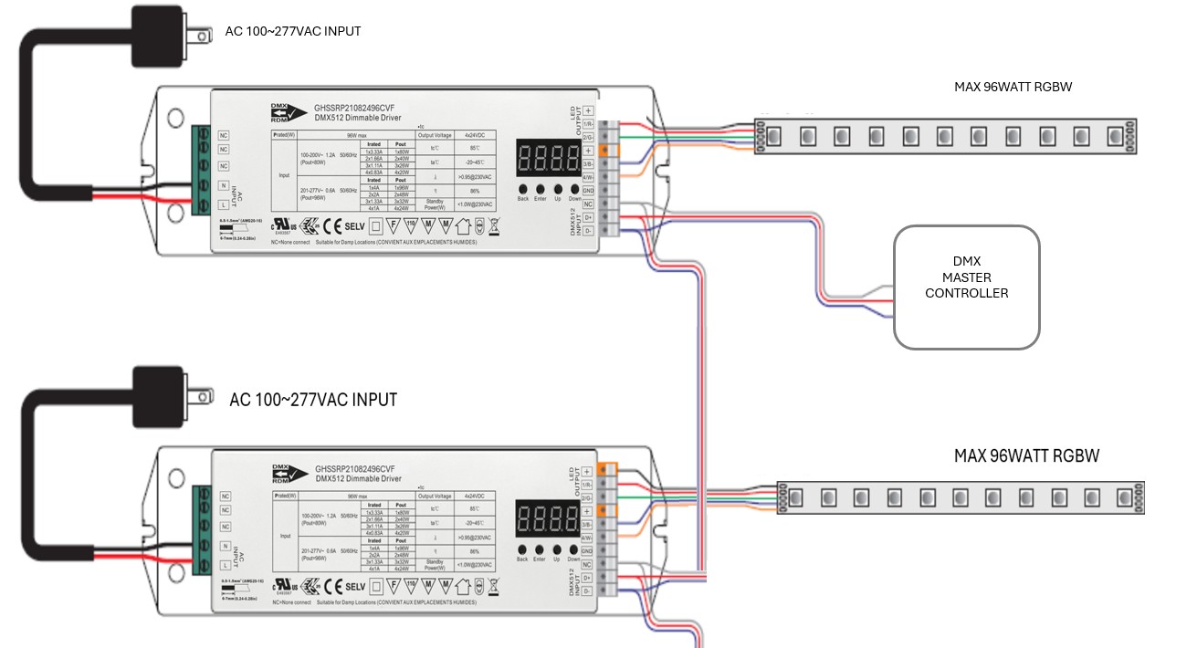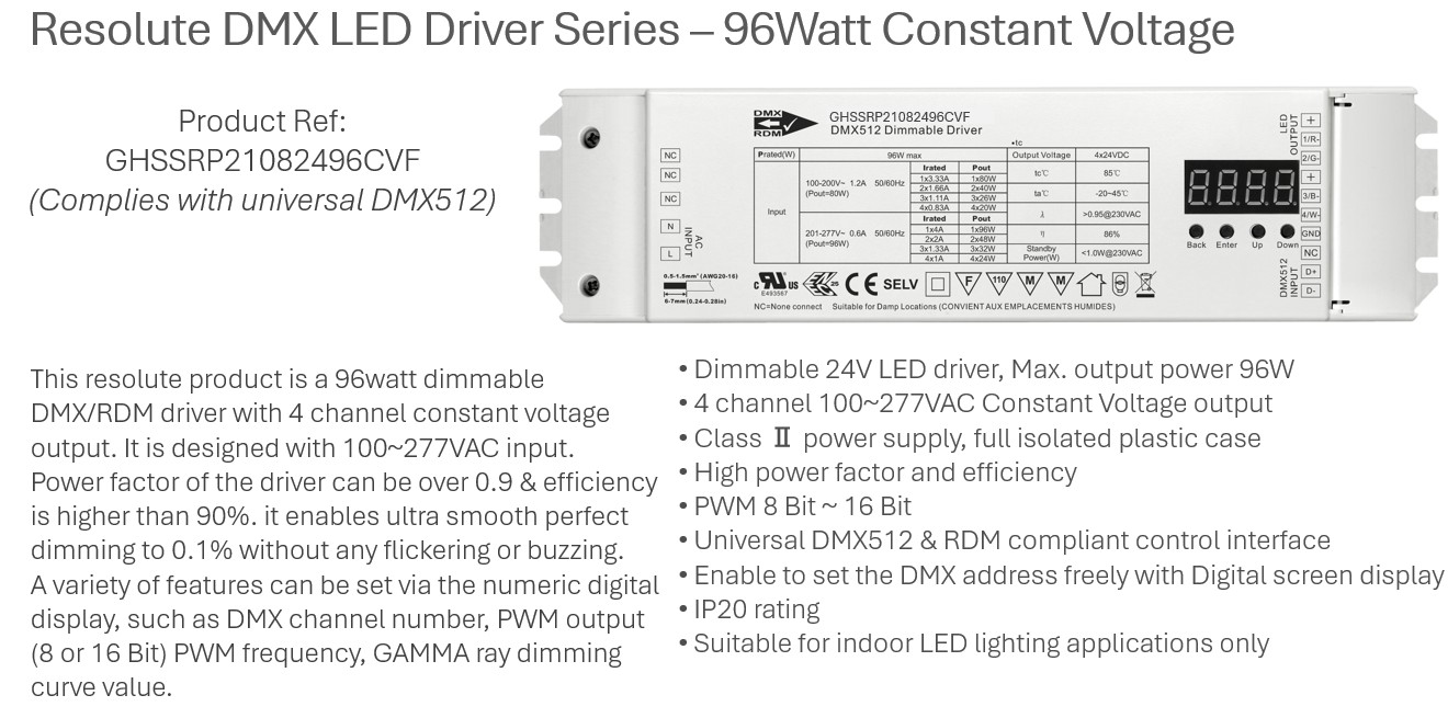 12Volt or 24Volt – This resolute product is a 96watt dimmable DMX/RDM driver with 4 channel constant voltage output. It is designed with 100~277VAC input.