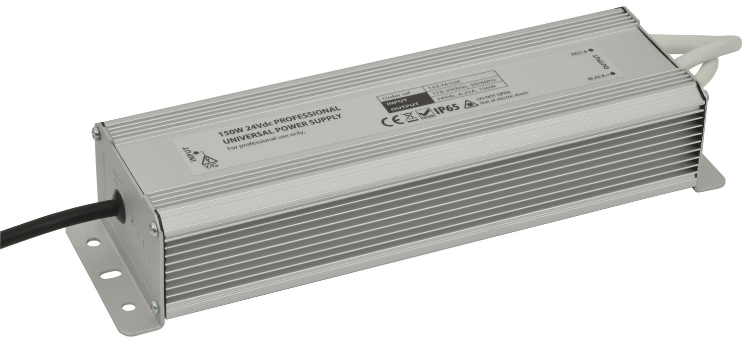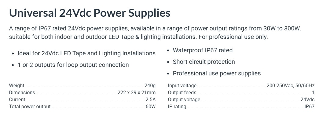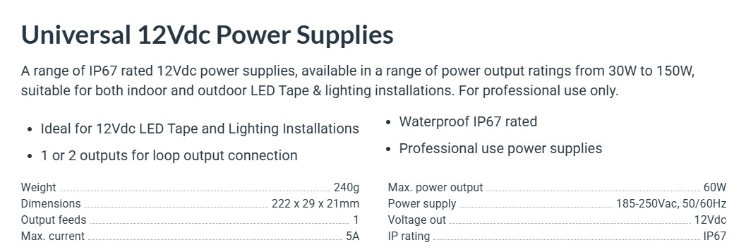 A range of IP67 rated 12Vdc and 24Vdc power supplies, available in a range of power output ratings from 30W to 150W, suitable for both indoor and outdoor LED Tape & lighting installations. For professional use only.