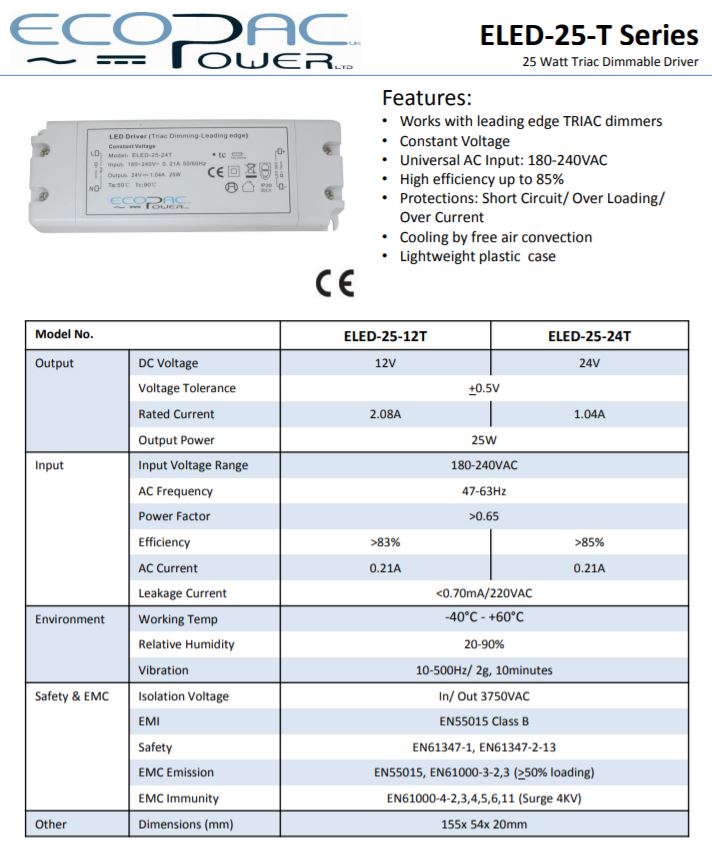 12V 25W / Mains Triac Dimmable Ecopac ELED-25-12T Constant Voltage LED Driver