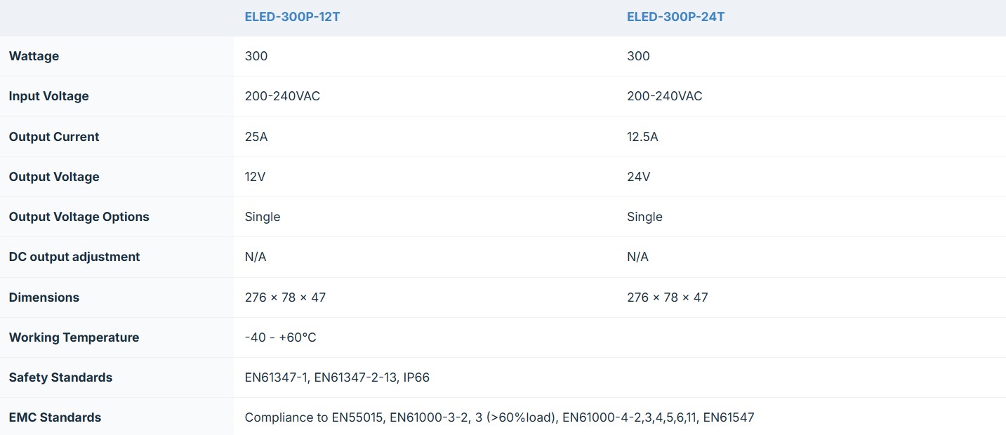 - Output Voltage Options: 12V (ELED-300P-12T) / 24V (ELED-300P-24T)