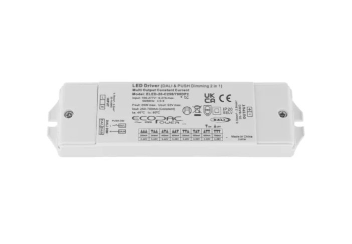 The ELED-20-C250/700DP2 is a 20W constant current LED driver offering smooth DALI & PUSH dimming. Ideal for architectural, retail and professional LED systems, it delivers quiet operation, high efficiency, and accurate current regulation.