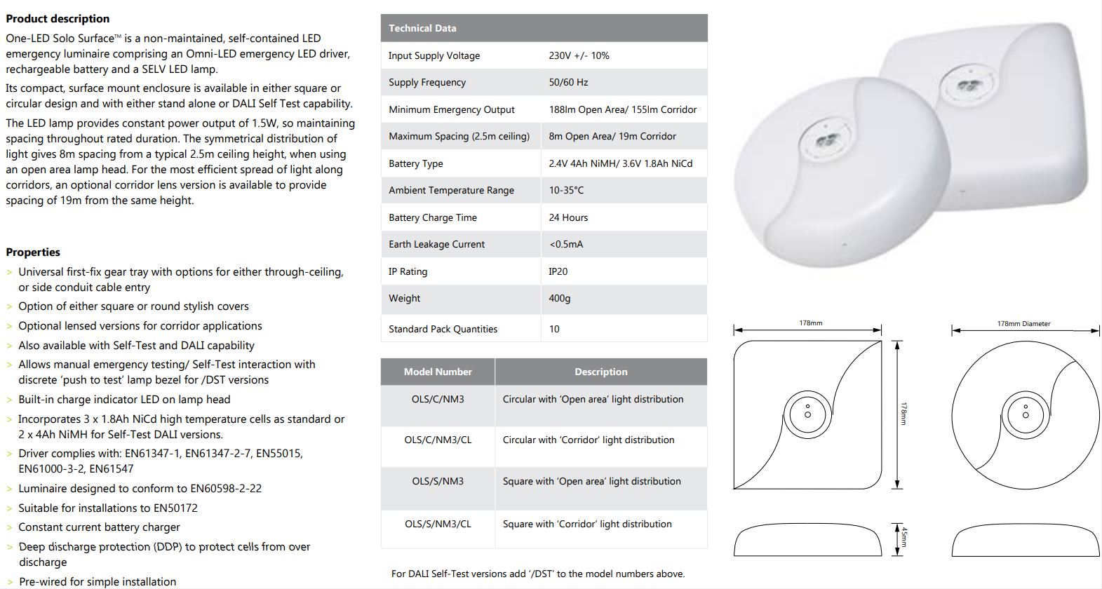 The ONE-LED SOLO SURFACE™ is a versatile, surface-mounted non-maintained emergency luminaire combining lamp, driver and battery into one unit. Designed for rapid surface installation with either square or round style covers, and available with advanced control options such as DALI-2, Self-Test, or wireless (Casambi/Silvair).