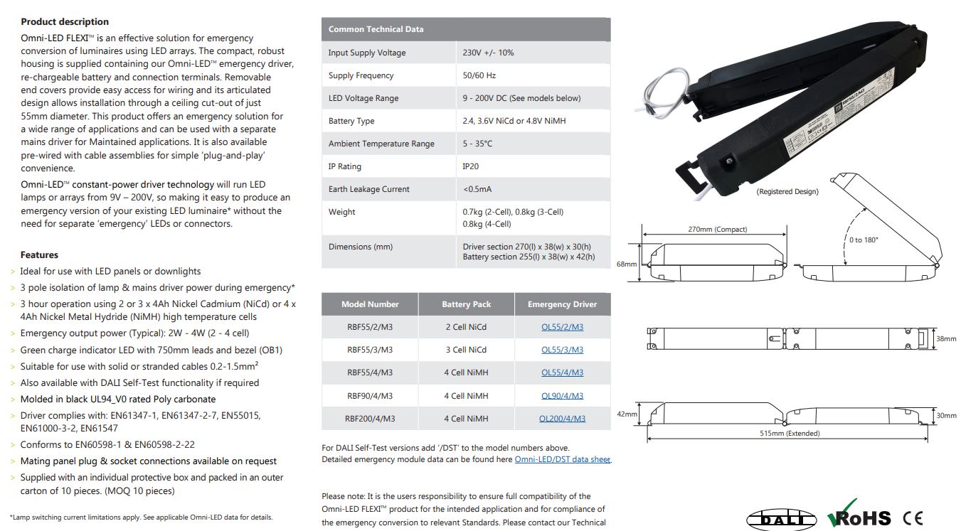 The Omni-LED FLEXI™ 230V RBF Articulated LED Remote-Box Emergency Conversion Solution is a versatile emergency lighting conversion module designed for LED panels, downlights and other luminaires, offering compact installation, articulated design and a range of battery and DALI Self-Test control-options to suit demanding applications.