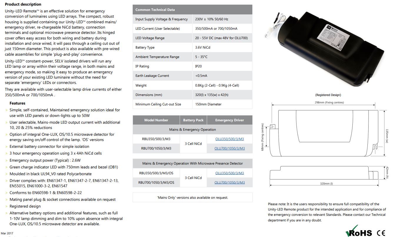 One-LUX UNITY-LED REMOTE RBU700-1050-3-M3 Emergency Conversion 700~1050mA