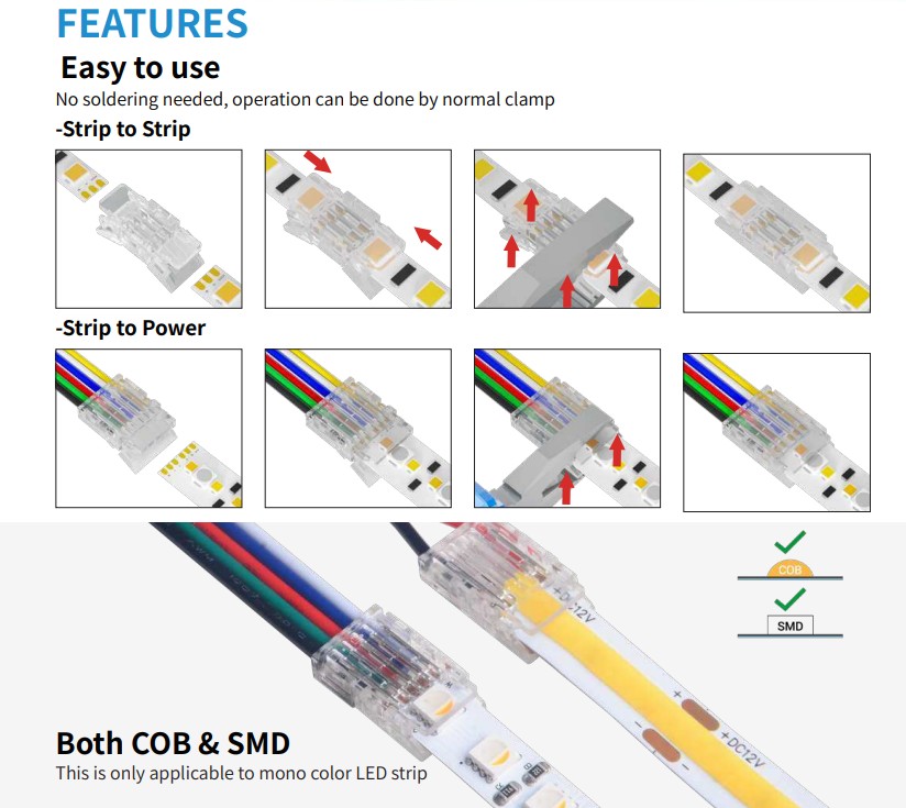 Some connectors are designed specifically for COB (chip-on-board) LED strips, while others work with traditional SMD (surface-mounted device) strips. It’s important to use the correct one for your specific LED strip to ensure a proper connection