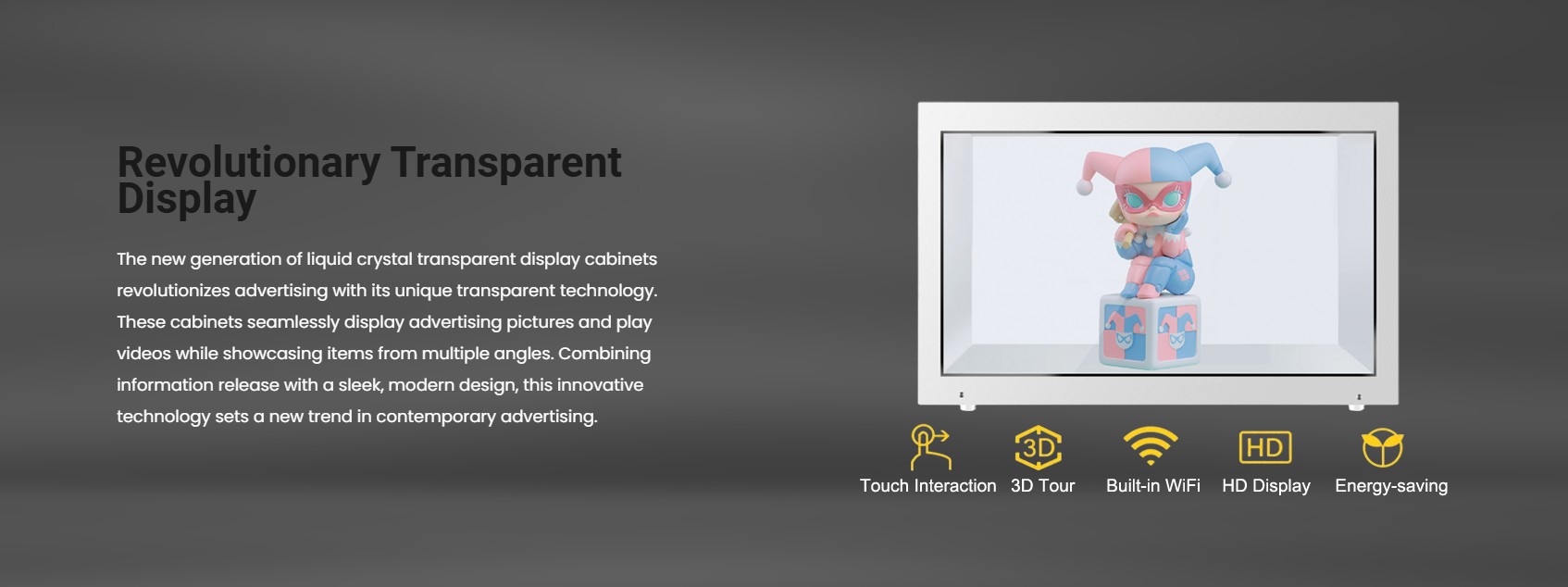 The Transparent LCD Box is perfect for stores and shopping malls to showcase jewelry and high-end goods. Ideal for window displays, airports, banks, hotel lobbies, and other crowded areas, it enhances point-of-sale product promotion with its sleek and innovative design.