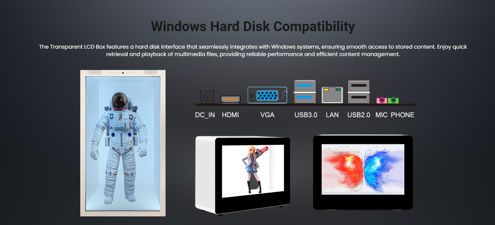 The Transparent LCD Box features a hard disk interface that seamlessly integrates with Windows systems, ensuring smooth access to stored content. Enjoy quick retrieval and playback of multimedia files, providing reliable performance and efficient content management.