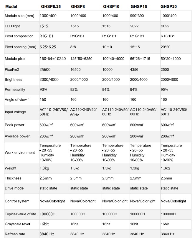 Pixel pitch(mm): 4/5/6/6.25/8/10/15/20