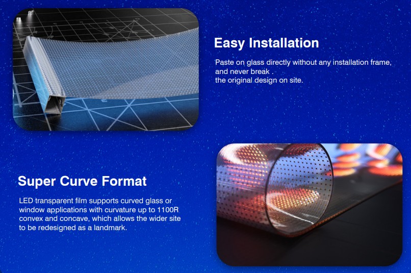 These LED film screens offer unparalleled scalability and flexibility. They can be freely cut and seamlessly stitched, allowing screen sizes and shapes to be customized to fit a variety of mounting options. Experience the freedom to create dynamic, tailored displays for any space.